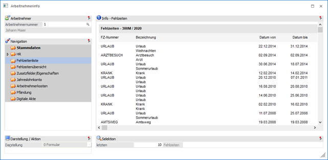 In dem Bereich "Fehlzeitenliste" werden - sofern vorhanden - die Fehlzeiten des aufgerufenen Arbeitnehmers angezeigt.