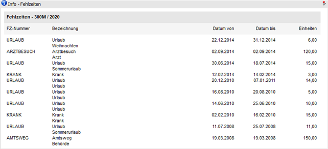 Der Bereich "Fehlzeitenliste" besteht aus den folgenden Info-Elementen: