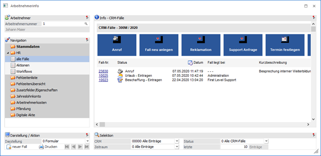 In der Ansicht "alle Fälle" werden CRM Fälle der Typen "CRM Aktion" und "CRM Workflow" angezeigt, welche für den Arbeitnehmer erfasst wurden. Die Darstellung kann hierbei in Form einer Formularansicht oder als Tabelle erfolgen.