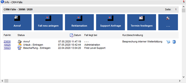 An dieser Stelle werden die CRM-Fälle, gemäß der nachfolgenden Selektion, dargestellt. Die Art der Anzeige kann mit Hilfe der Option "Darstellung" gewählt werden.