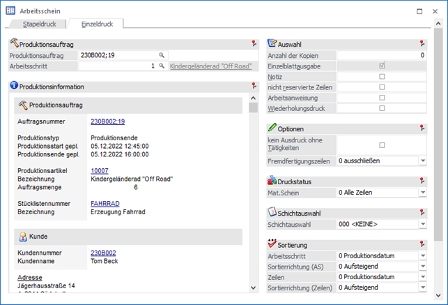 In dem Register "Einzeldruck" des Arbeitsscheins kann ein Arbeitsschein für einen bestimmten Arbeitsschritt eines Produktionsauftrags gedruckt werden.