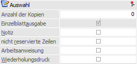 Die Checkbox "Einzelblattausgabe" kann in diesem Register nicht deaktiviert werden, da beim Einzeldruck bereits ein Arbeitsschein pro Arbeitsschritt erzeugt wird.