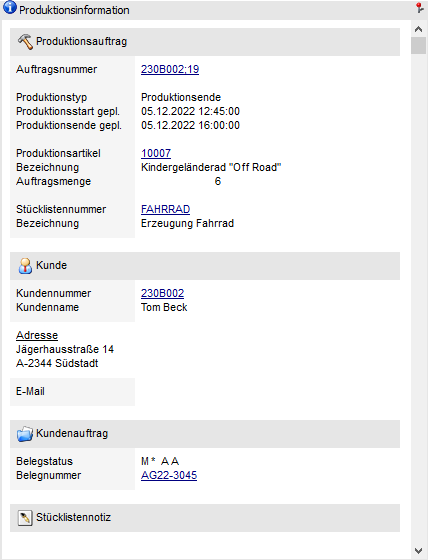 Die Notiz des Fertigprodukts wird bei der Anlage eines Produktionsauftrags automatisch mit dem Notiz-Text der Stückliste gefüllt. Eine nachträgliche Änderung kann z.B. im Programm Arbeitsschrittstatus vorgenommen werden.