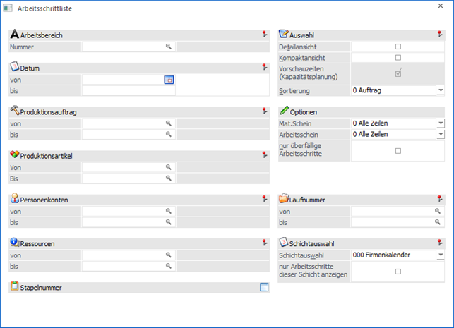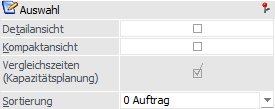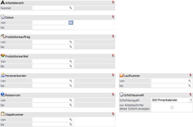 Erfolgt an dieser Stelle eine Einschränkung auf Ressourcen, so werden nur jene Produktionsaufträge bzw. Arbeitsschritte für die Ausgabe berücksichtigt, bei denen die angegebenen Ressourcen reserviert wurden.