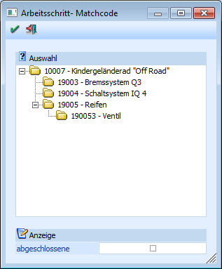 Wenn Sie auf die Lupe neben dem Feld "Arbeitsschritt" oder F9 drücken, erhalten Sie eine Aufstellung (in Form einer Baumstruktur) der in diesem Produktionsauftrag vorhandenen Arbeitsschritte.
