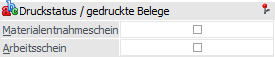 Hier kann der Druckstatus des Material- und Arbeitsscheines verändert werden. Werden die Häkchen gesetzt, so bedeutet dieses, dass der jeweilige Schein bereits gedruckt wurde. Werden gesetzte Haken entfernt, so wird auch der Druckstatus auf "nicht gedruckt" zurückgestellt.