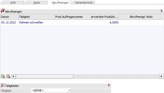 In diesem Register werden die Mengen, welcher noch produziert werden, angezeigt (d.h. die SOLL-Mengen). Zusätzlich zu diesen Soll-Mengen kann man zukünftig (wird noch nicht unterstützt) auch die gewünschte Abruf-Menge eingeben.
