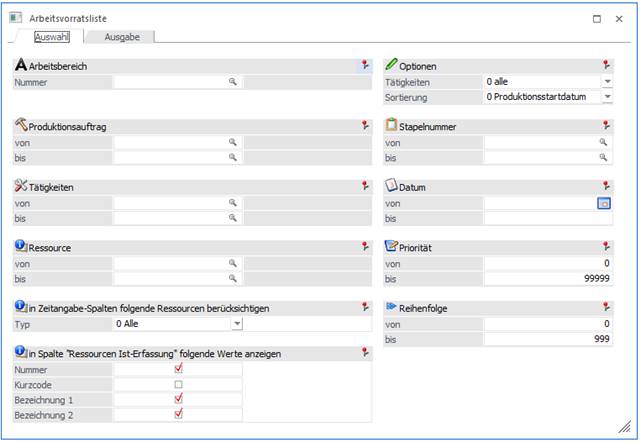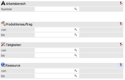 Der Arbeitsbereich kann gewählt werden und über diesen können andere Selektionen wie z.B. Ressourcen, Produktionsaufträge, Tätigkeiten vorbelegt werden.