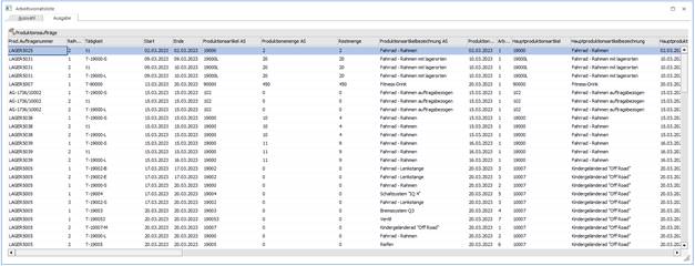 Beim Betätigen des Buttons Anzeigen wird in das Register Ausgabe gewechselt wo aufgrund der vorgenommenen Auswahl die offenen Produktionsaufträge angezeigt werden.