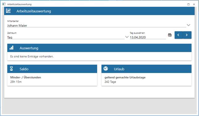 Nach der Auswahl des Arbeitnehmers bzw. Mitarbeiters und des Zeitraumes werden die Daten Sollzeit, Arbeitszeit, Fehlzeit und Urlaub unter dem Bereich "Auswertung" angezeigt.
