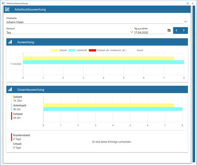 Abhängig von der Auswahl des Zeitraumes wird im Bereich "Gesamtauswertung eine Summe der Soll-, Arbeits-, Fehlzeit, Krank und Urlaub angedruckt.