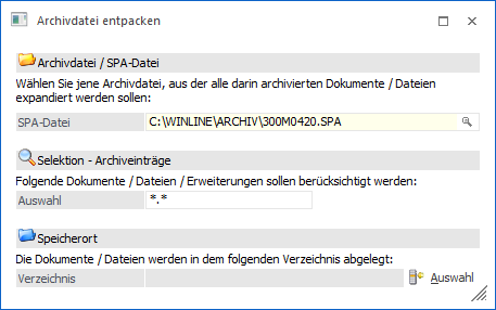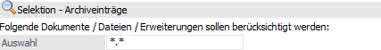 Hier kann eine Einschränkung auf bestimmte Dateien vorgenommen werden, wobei auch Wildcards (?) oder Joker (*) verwendet werden können. Z.B. *.XLS entpackt nur alle Dateien mit der Erweiterung XLS, P02W4?.300M.*.SPL entpackt alle Belegformulare des Mandanten 300M.