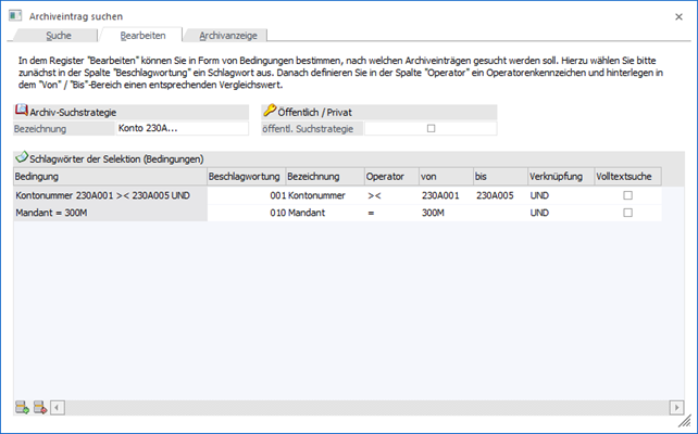 Wenn die Option "öffentl. Suchstrategie" aktiviert wurde, dann steht diese Suche allen Benutzern zur Verfügung. Bleibt die Option inaktiv, dann steht die Suche nur jenem Benutzer zur Verfügung, der die Suche erstellt hat. Wurde im Register "Suche" der Eintrag "temporäre Archivsuche" gewählt, so kann hier keine Auswahl erfolgen.