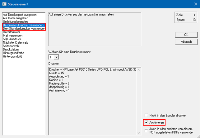 Die Aktivierung erfolgt dabei durch Einfügen des Steuerelements "Den Standarddrucker verwenden" bzw. "Bestimmten Drucker verwenden" in die jeweiligen Formulare. Durch Setzen der Option "Archivieren" wird der jeweilige AUX-Befehl um die Option "ARCHIVE" erweitert. Sobald diese Kennung im AUX-Befehl vorhanden ist, wird das Dokument während des Drucks in das Archiv abgelegt.