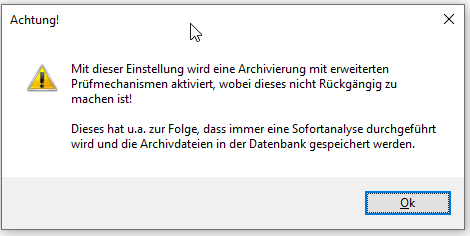 Ist die Einstellung auf "1 - Lt. Formulartyp (revisionssichere Archivierung) eingestellt kommt der Hinweis, dass die Sofortanalyse aktiviert sein und die Archivierung in der Datenbank erfolgen muss.