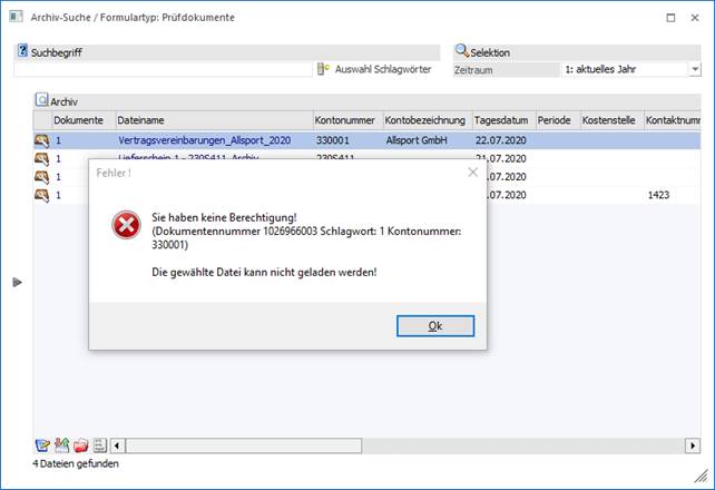 Wird nun versucht ein Archiv-Dokument, in dem diese Kontonummer "330001" als Schlagwort hinterlegt ist, von einem Benutzer aufzurufen, der nicht im Berechtigungsprofil zugewiesen ist, erfolgt eine entsprechende Hinweismeldung: