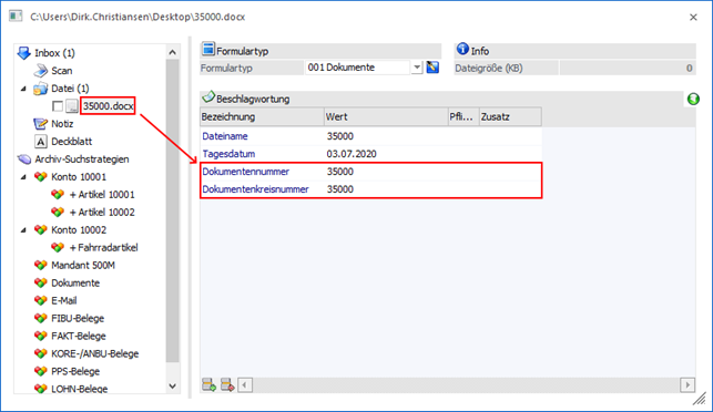 Durch die Aktivierung dieser Option kann die Dokumenten-ID und die Dokumentenkreisnummer beeinflusst werden. Handelt es sich um eine zu archivierende Datei mit numerischem Namen, dann wird diese Nummer als Dokumenten-ID und Dokumentenkreisnummer verwendet. Hierbei sind folgende Punkte zu beachten: