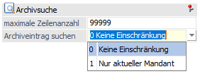 Bei der Einstellung "1 Nur aktueller Mandant" erfolgt in dem Menüpunkt "Archiveintrag suchen" bzw. "Archiv Suche" nur in dem Mandanten die Dokumente gesucht / angezeigt werden. Die Einstellung erfolgt pro Mandant. Im Standard steht dies auf "0 - Keine Einschränkung".