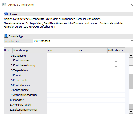 Für alle in der Tabelle angezeigten Schlagwörter kann ein Suchkriterium hinterlegt werden. Die Suchkriterien werden hierbei alle mit UND verknüpft, so dass nur jene Archiveinträge gezeigt werden, die auf alle Suchbegriffe zutreffen.