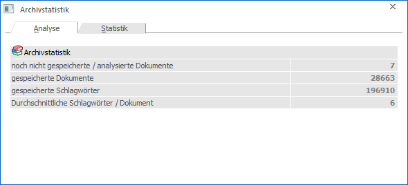 In dem Register "Analyse" zuerst eine kurze Statistik über die vorhandenen Archiv-Einträge gezeigt: