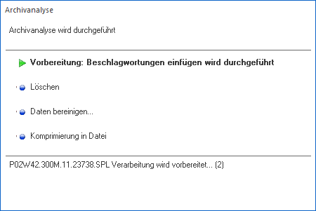 Durch Anklicken des Buttons "Speicherrn" werden die vorbereiteten Dokumente analysiert und die Beschlagwortungen in das Archiv übernommen. Der Fortschritt hierüber wird über ein eigenes Statusfenster dargestellt.