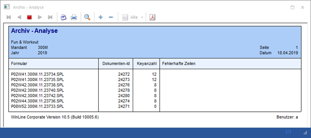 Mit Hilfe des Buttons "Ausgabe Bildschirm" oder der Taste F5 wird die Auswertung am Bildschirm ausgegeben.