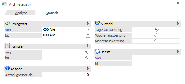 Durch Anwahl des Registers "Statistik" kann eine Liste aller vorhandenen Schlagwörter ausgegeben werden, wobei folgende Einschränkungen vorgenommen werden können: