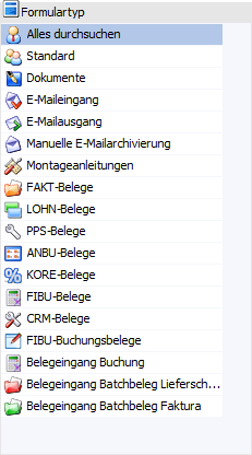 In der Tabelle "Formulartyp" werden alle angelegten Formulartypen angezeigt. Per Doppelklick wird automatisch eine Archivsuche für den gewählten Typ gestartet.