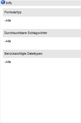 Unter Info werden die Suchkriterien des gewählten Formulartyps und der Suchstrategie aufgeführt.