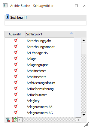 Durch Anwahl es Buttons "Auswahl Schlagwörter" wird das Fenster "Archiv-Suche - Schlagwörter" geöffnet. Hier kann definiert, in welche Schlagwörtern nach dem Suchbegriff der Archivsuche gesucht werden soll.