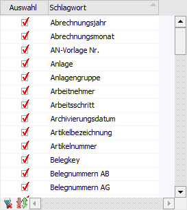 In der Tabelle werden nach Auslösen der Suche (bestätigen des Suchbegriffs) die gefundenen Schlagwörter angezeigt. Per Spalte "Auswahl" kann definiert werden, in welchen Schlagwörtern nach dem Suchbegriff der Archivsuche gesucht werden soll.
