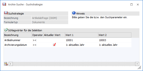 Sofern in der Suchstrategie des Fensters Archiv-Suche eine Frage definiert wurde, geht beim Auslösen der Suche das "Archiv-Suche - Suchstrategie" auf. In diesem kann der bzw. können die Suchparameter definiert und die Suche endgültig ausgelöst / aktualisiert werden.