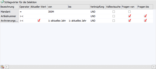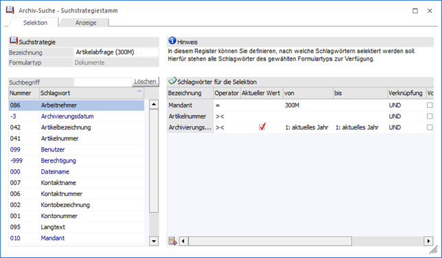 Durch Aktivierung wird beim Auslösen der Suche das Fenster Archiv-Suche - Suchstrategie geöffnet, in welchem die Suchparameter hinterlegt werden können.