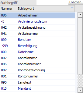 In dieser Tabelle werden alle Schlagwörter gemäß Formulartyp angezeigt. Per Doppelklick können Felder in die Tabelle "Schlagwörter für die Selektion" übernommen werden. Über das Feld "Suchbegriff" ist eine Volltextsuche in den Spalten "Nummer" und "Bezeichnung" möglich.