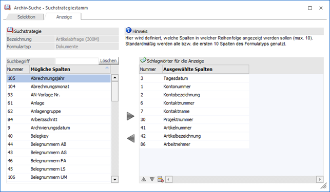In dem Register "Anzeige" kann definiert werden, welche 10 Beschlagwortungsspalten in der Archivanzeige dargestellt werden sollen.