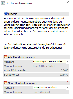 Aus der Auswahlliste kann jener Mandant gewählt werden, welchem die Archiveinträge zugewiesen werden sollen; z.B. alle Archiveinträge, welche den Mandanten "500M" hinterlegt haben, bekommen den neuen Eintrag "300M" zugewiesen und sind somit im Mandanten "300M" verfügbar.