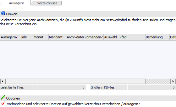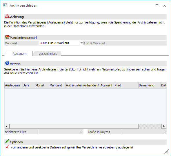 Wenn noch kein(e) Verzeichnis(se) für eine Auslagerung hinterlegt wurde(n), so erscheint nach Auswahl des Mandanten die folgende Meldung: