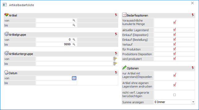 An dieser Stelle kann eine Eingrenzung des Zeitraums, für welchen der Artikelbedarf errechnet werden soll, erfolgen.