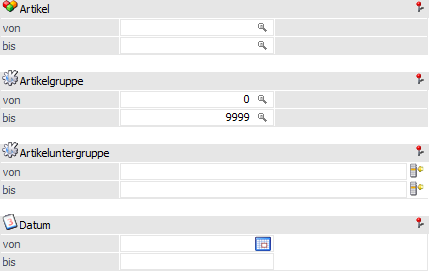 In diesen Feldern kann nach den Artikelgruppen eingeschränkt werden, welche in der Liste berücksichtigt werden sollen.