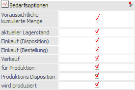 In diesem Bereich kann selektiv ausgewählt werden, welche Einflussfaktoren auf den Artikelbedarf berücksichtigt werden sollen.
