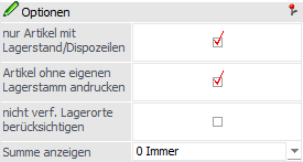 Ist diese Option aktiviert, so werden nur Artikel angezeigt, die einen Lagerstand größer 0 oder Dispozeilen haben.