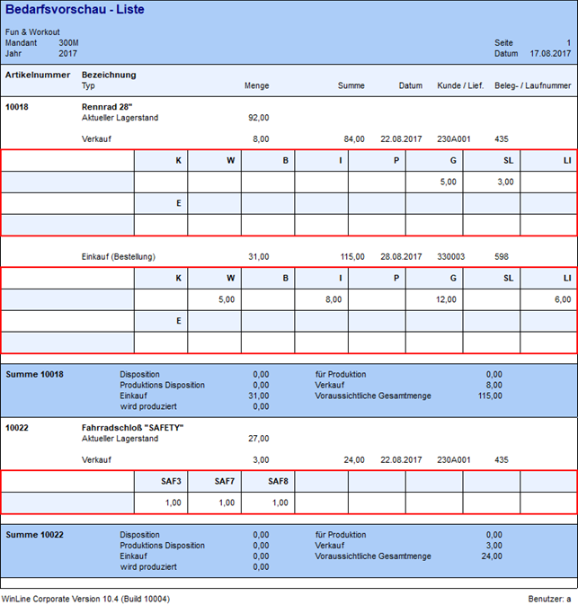 … aufgerufen werden. Innerhalb dieser Auswertung wird der voraussichtliche Artikelbedarf zu einem bestimmten Zeitpunkt ausgewiesen.