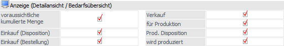 In dem Bereich "Anzeige" kann definiert werden, welche Bedarfszeilen in den Registern "Detailansicht" und "Bedarfsübersicht" ausgewiesen werden sollen.