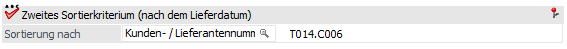 Für die weitere Sortierung kann ein Wert/Feld aus der Artikeldispositionstabelle (T014) gewählt werden. Für die Suche steht der Matchcode zur Verfügung. Das selektierte Feld wird benutzerspezifisch gespeichert.