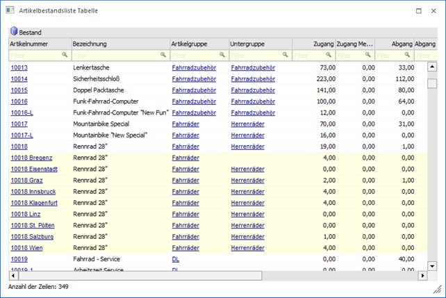 Die Basis der Artikelzeilen in der Tabelle bildet immer die Selektion in der Artikelliste. D.h. in der Tabelle kann dieses Datenmaterial nur weiter eingeschränkt werden.