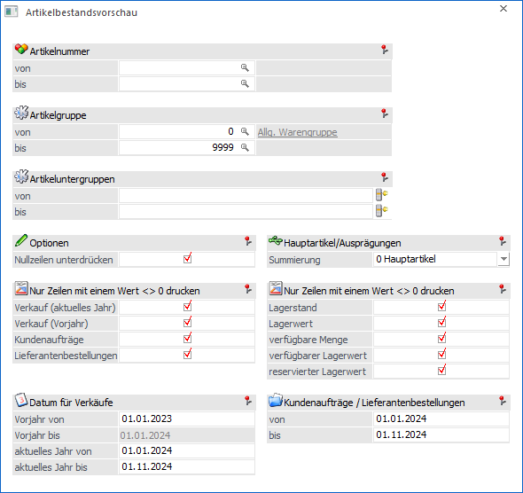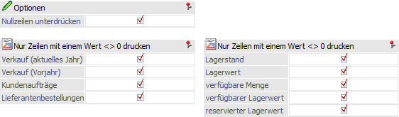 Mit Hilfe der Checkboxen kann ausgewählt werden, dass nur Zeilen mit Werten ungleich Null angedruckt werden. Werden alle Checkboxen ausgewählt, werden alle Artikel angezeigt, die nicht in allen Spalten einen Nullwert aufweisen, d. h. es wird jeder Artikel angezeigt, der in einer dieser Spalten einen Wert ungleich 0 aufweist.