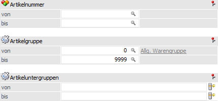 In den Eingabefeldern von - bis kann jeweils eine Einschränkung auf die Artikel bzw. auf die Artikelgruppen und Artikeluntergruppen vorgenommen werden, die ausgewertet werden sollen.