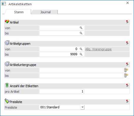 Für die Ausgabe von Artikeletiketten (basierend auf dem Artikeljournal) können folgende Einschränkungen getroffen werden: