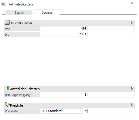 In dem Register "Journal" können Artikeletiketten aufgrund des Artikeljournals, z.B. zur Auspreisung von eingegangenen Lieferungen, erzeugt werden. Hierbei kann die im Lagerzugang ausgewiesene Menge (Lagerbuchhaltung bzw. Belegerfassen) beim Druck der Artikeletiketten automatisch verarbeitet werden.