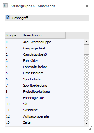Wenn der Fokus in dem Feld "Artikelgruppe" liegt und das Lupen-Symbol bzw. die Taste F9 gedrückt wird, dann öffnet sich das Programm "Artikelgruppen - Matchcode". An dieser Stelle kann gezielt nach Artikelgruppen gesucht werden.